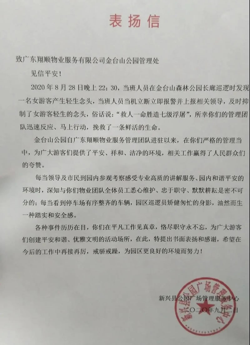 知悉此事后,新興縣公園廣場管理服務(wù)中心對我司隊(duì)員對于異常情況的及時發(fā)現(xiàn)和冷靜處理給予了高度的肯定和表揚(yáng)。